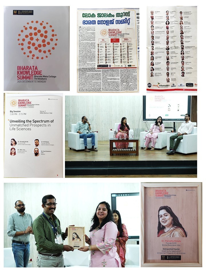 Dr. Parvathy Kolady, Founder & Managing Director of Bioroot Exploration India, was honoured to be invited as a speaker at the Bharata Knowledge Summit 2025, hosted by Bharata Mata College, Thrikkakara. She delivered a session titled “Unveiling the Spectrum of Unmatched Prospects in Life Sciences,” highlighting career pathways, research opportunities, entrepreneurship and emerging trends in the bioscience sector. The summit fostered meaningful industry–academia interaction and the enthusiastic participation of students made the session truly impactful.